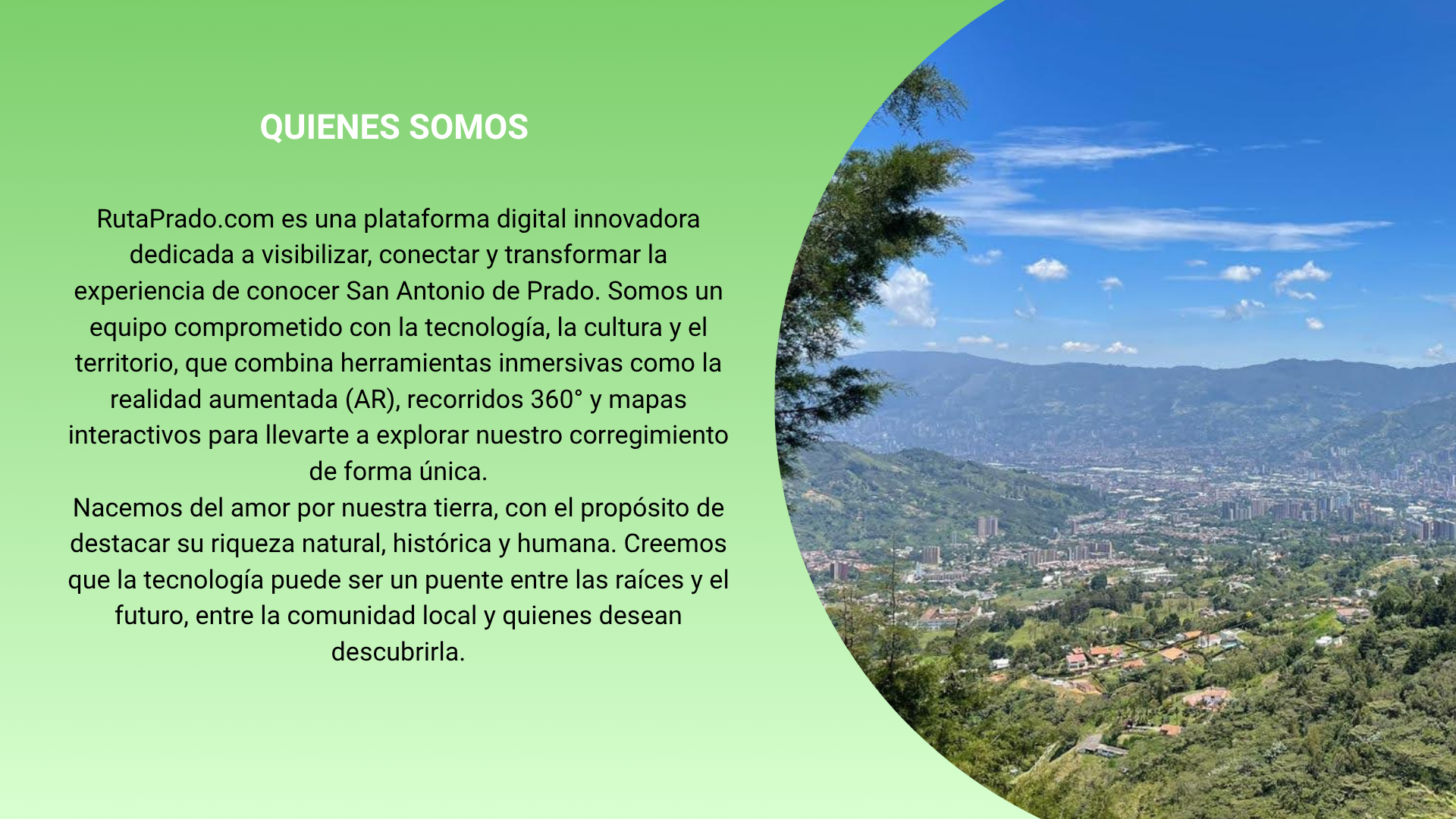 Impulsar el turismo consciente, fortalecer la identidad pradeña y promover el desarrollo local a través de una experiencia virtual inmersiva. Queremos que RutaPrado.com sea una ventana para los visitantes, una herramienta para los emprendedores y un orgullo para quienes habitan este territorio lleno de historias, senderos y sueños.